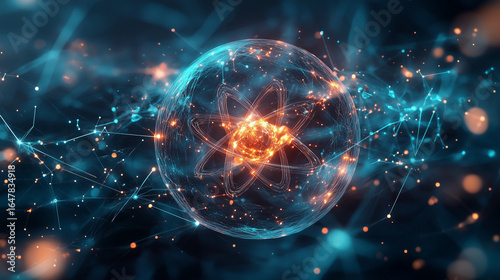 © Zhang, Obraz premium Unstable atom nucleus with spinning electrons on tech background.