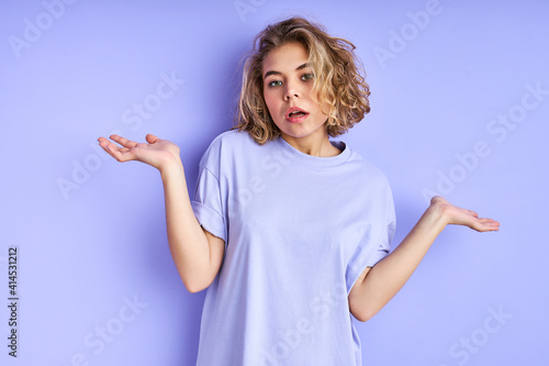 © Roman, Fototapeta premium unsure female model shrugs shoulders with uncertainty isolated in studio, makes questioning gesture, has clueless and confused look, poses alone against purple wall. Who cares