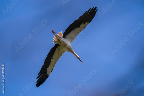 Obraz premium Unterseite vom Storch im Flug vor blauem Himmel