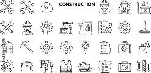 Fototapeta premium Untitled-1A22, construction line icons wrench, helmet, worker, fist, gear,...