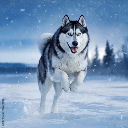 Naklejka premium Untitled design 1, Siberian Husky Dog Running in Snow, Energetic Husky Dog in Winter Landscape, Fluffy Siberian Husky Dog Playing in Snowy Forest.