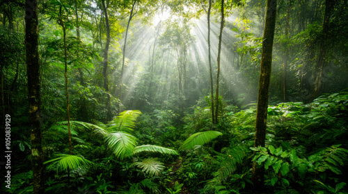 Fototapeta premium Untouched tropical forest, saturated green foliage, sun rays
