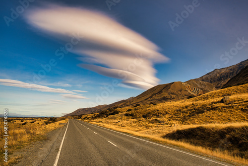 © Stewart, Fototapeta premium unusual cloudscape over the highway on the way to Mt Cook National Park