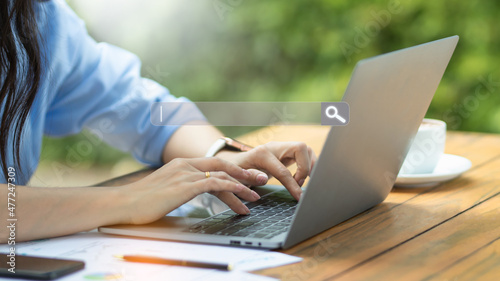 Fototapeta premium Up close with business women working with smartphones and laptops and digital tablet computers in modern office with virtual icon diagram.