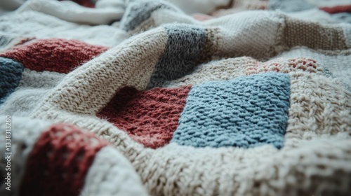 Fototapeta premium Upcycling Craft for Sustainable Fashion Creations Concept. Cozy knitted blanket with colorful patchwork patterns draped elegantly on soft surface