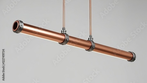 Fototapeta premium Upcycling recycling transformation. A sleek, modern copper pendant light with three sections, suspended by cables against a clean backdrop, showcasing industrial design aesthetics.