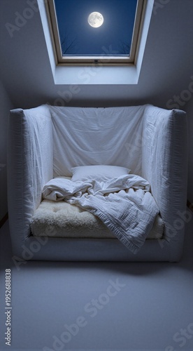 © Beniamin, Fototapeta premium Upholstered reading chair with rumpled bedding under moonlit skylight
