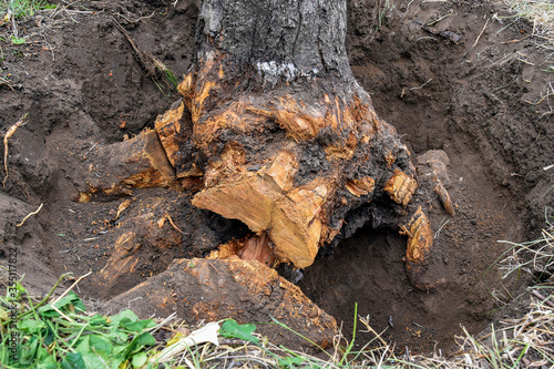 Obraz premium Uprooting old dry fruit tree in garden. Large pit with sawn and chopped tree roots. Farming. Close-up. Selective focus.