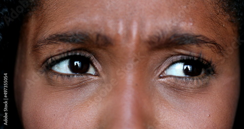 Fototapeta premium Upset African young woman macro close-up eyes, expressive angry black girl in...