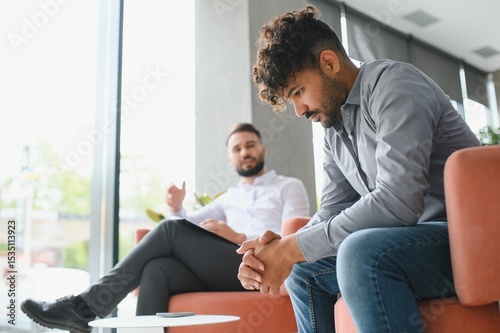 © Serhii, Fototapeta premium Upset arab man suffering from ptsd talking with psychologist
