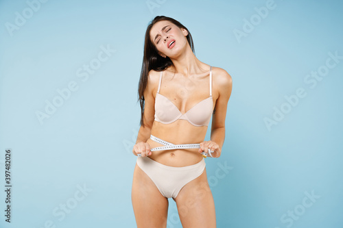 Obraz premium Upset displeased dissatisfied young brunette woman 20s in beige brassiere underwear standing posing measuring waist with measure tape isolated on pastel blue colour wall background studio portrait.