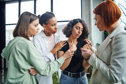 Obraz premium upset multiracial woman standing with closed eyes near multiethnic friends and motivation coach supporting her during psychology session, problem-solving and psychological help concept