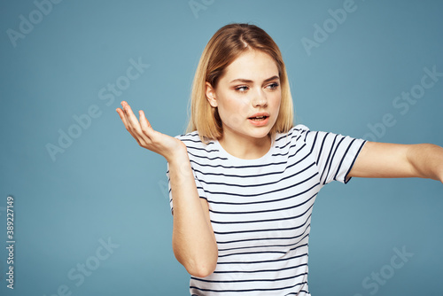 Fototapeta premium Upset woman emotions displeasure gestures with hands blue background