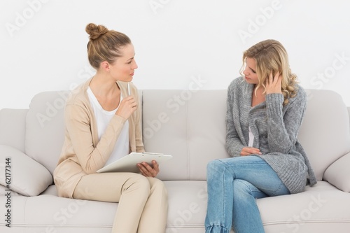 Obraz premium Upset woman talking to her therapist on the couch