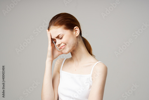 Fototapeta premium upset woman touching face with hands cosmetology clean skin irritability