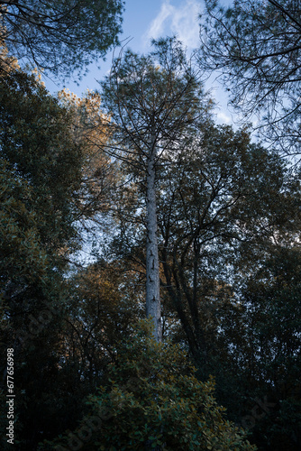 © Diego, Fototapeta premium Upward View of Pine Tree in Shadow with Partially Cloudy Sky