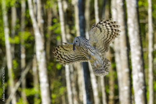 Obraz premium Ural owl flying with a mouse in its beak
