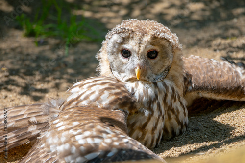 Fototapeta premium Ural owl, Strix uralensis, large nocturnal owl sitting on the ground