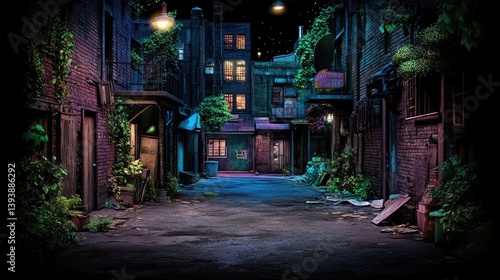© Arvi, Fototapeta premium Urban alleyway at night. Lush greenery and dimly lit buildings line a narrow passage