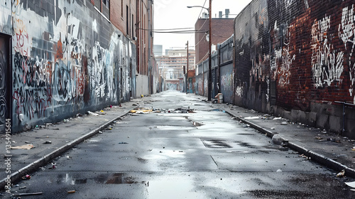 Fototapeta premium Urban alleyway, graffiti-covered walls, littered street, rain-soaked pavement