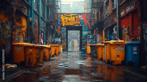 Fototapeta premium Urban Alleyway Graffiti Dumpsters Wet Ground