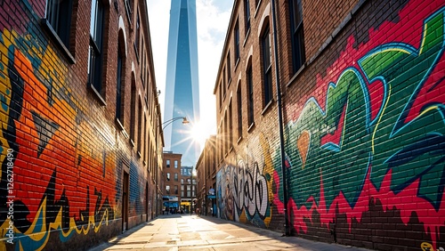 © wisuals, Fototapeta premium Urban Alleyway with Graffiti Art and Skyscraper Backdrop