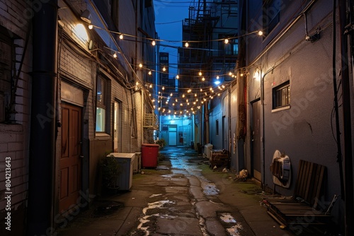 © OhmArt, Fototapeta premium Urban alleyway with string lights overhead.