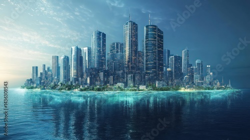 Naklejka premium Urban aquatic island city skyline reflecting upon the ocean's watery expanse