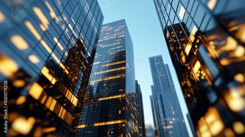 Fototapeta premium Urban architecture skyscrapers reflections bokeh innovation progress. AI...