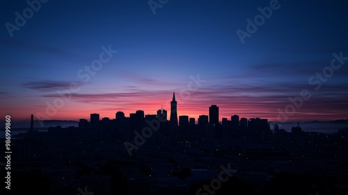 © Jakkarin, Fototapeta premium Urban Awakening: Dramatic City Skyline Silhouetted at Sunrise