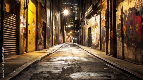 Fototapeta premium Urban backstreet illuminated at night, showing street art and wet pavement