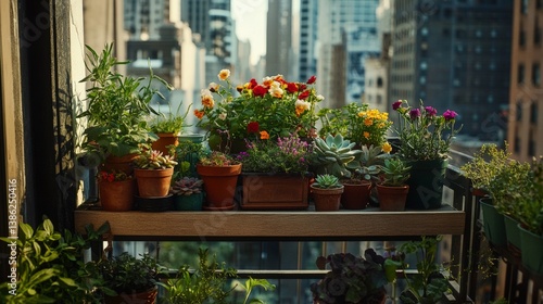 © Kenny, Fototapeta premium Urban balcony garden with colorful flowers and succulents in cityscape