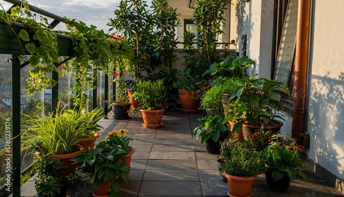 © Lina, Fototapeta premium Urban Balcony Garden with Green Plants and Terra Cotta Pots