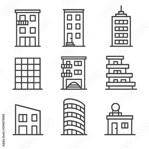 Obraz premium Urban Building Icons. Line style icons of urban residential buildings: city balcony apartment, walk-up unit building, high-rise