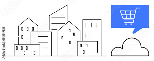 Fototapeta premium Urban buildings in black lines, cloud beneath blue speech bubble with shopping cart icon. Ideal for cityscape branding, real estate, commercial advertising, online shopping, digital marketing, smart