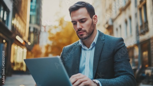 © OLEKSANDR, Fototapeta premium Urban businessman stylish demeanor plans corporate strategies. Isolation and Loneliness Rise in Remote Work Settings. Man embodies drive success fast-paced business world