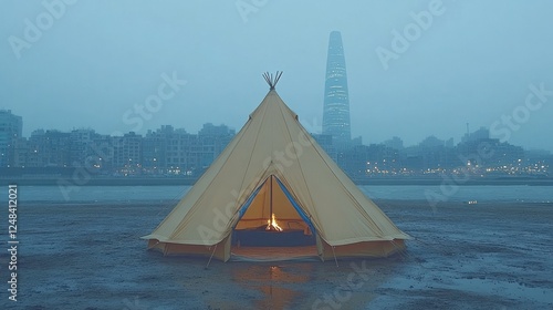 © novitasary, Obraz premium Urban Camping: A Teepee by the Cityscape