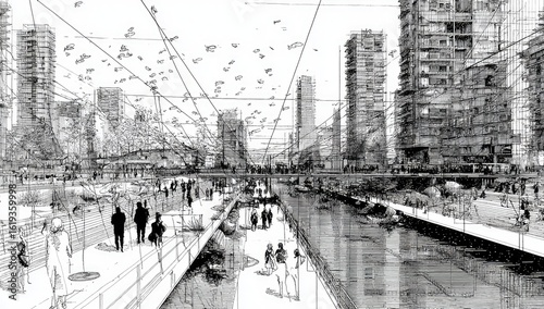 © Dina, Fototapeta premium Urban Canal Regeneration Cityscape Sketch