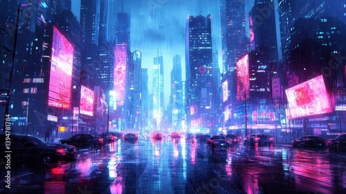 Obraz premium Urban Cityscape at Night with Neon Signs and Rain Reflections