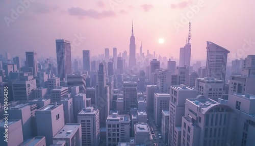 Obraz premium Urban Cityscape at Sunset with Soft Light and Skyline View of Modern Architecture and Tall Buildings