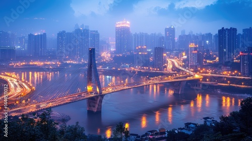 © Andi, Naklejka premium Urban cityscape at twilight, showcasing a bridge over a river.