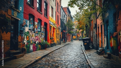© sarun, Fototapeta premium Urban cityscape with a mix of old and new buildings, cobblestone streets, and colorful street art adding character to the area.