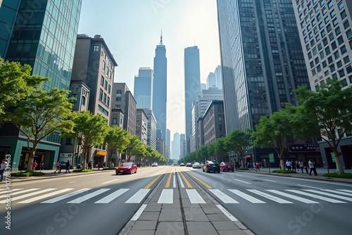 © S u n n y B u n n y, Fototapeta premium Urban cityscape with skyscrapers and busy pedestrian street in daylight.