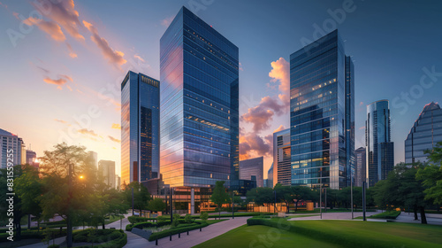 Fototapeta premium Urban cityscape with skyscrapers and sunset light