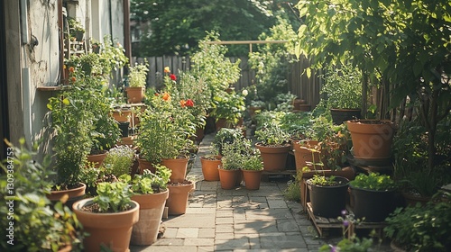 Fototapeta premium urban community garden with lush greenery potted plants sustainable lifestyle eco living peaceful environment and healthy lifestyle concept