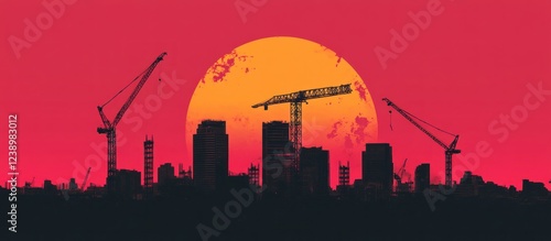 © minahus, Fototapeta premium Urban Construction at Sunset: A Silhouette Cityscape