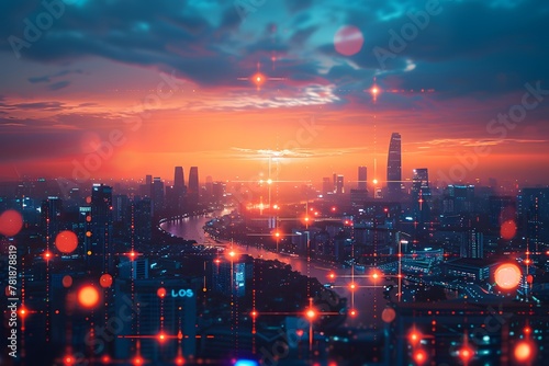 Fototapeta premium Urban Data Stream: Futuristic Cityscape with Digital Overlays and Glowing Lights