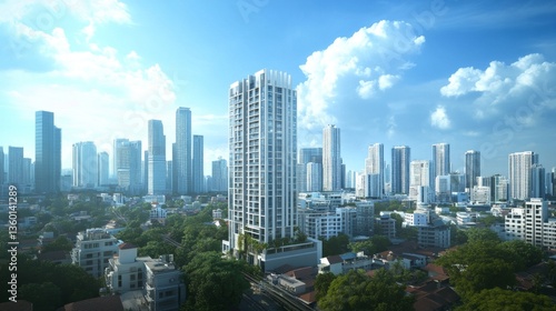 © songpol152, Fototapeta premium Urban development tower rising amidst cityscape downtown area architectural visualization bright atmosphere aerial perspective