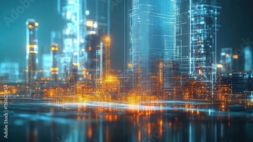 Fototapeta premium Urban development under construction with holographic building plans projected in mid-air, sleek modern machinery, neon lighting, sharp focus on future growth