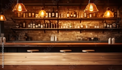 © Wuttichai, Fototapeta premium Urban elegance. Bar counter aesthetics. Empty glasses full stories. Night at pub. Empty wooden table. Restaurant ambiance